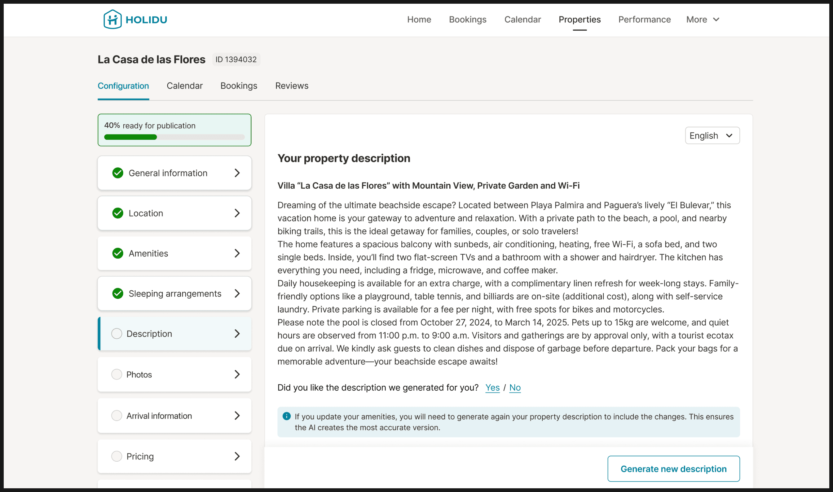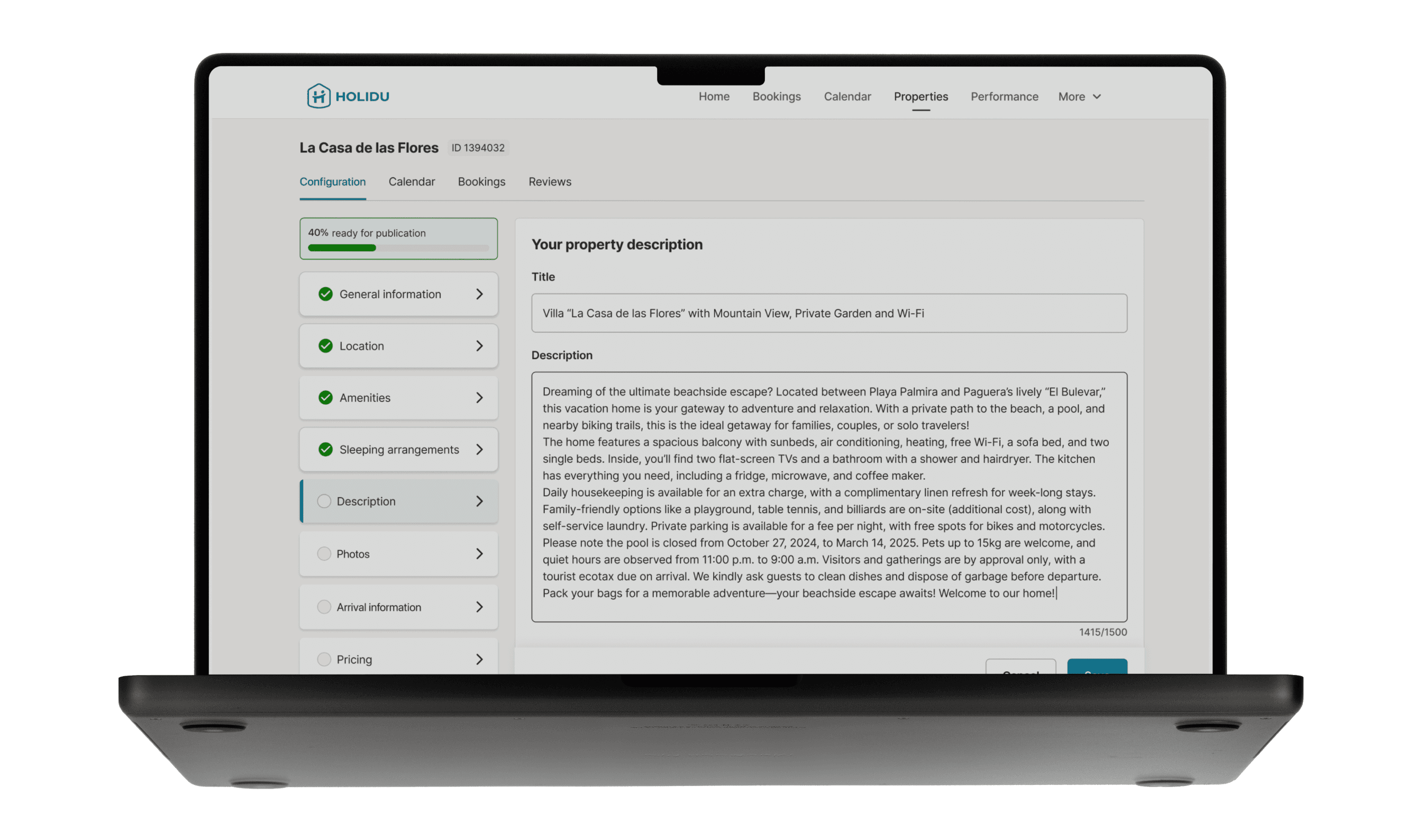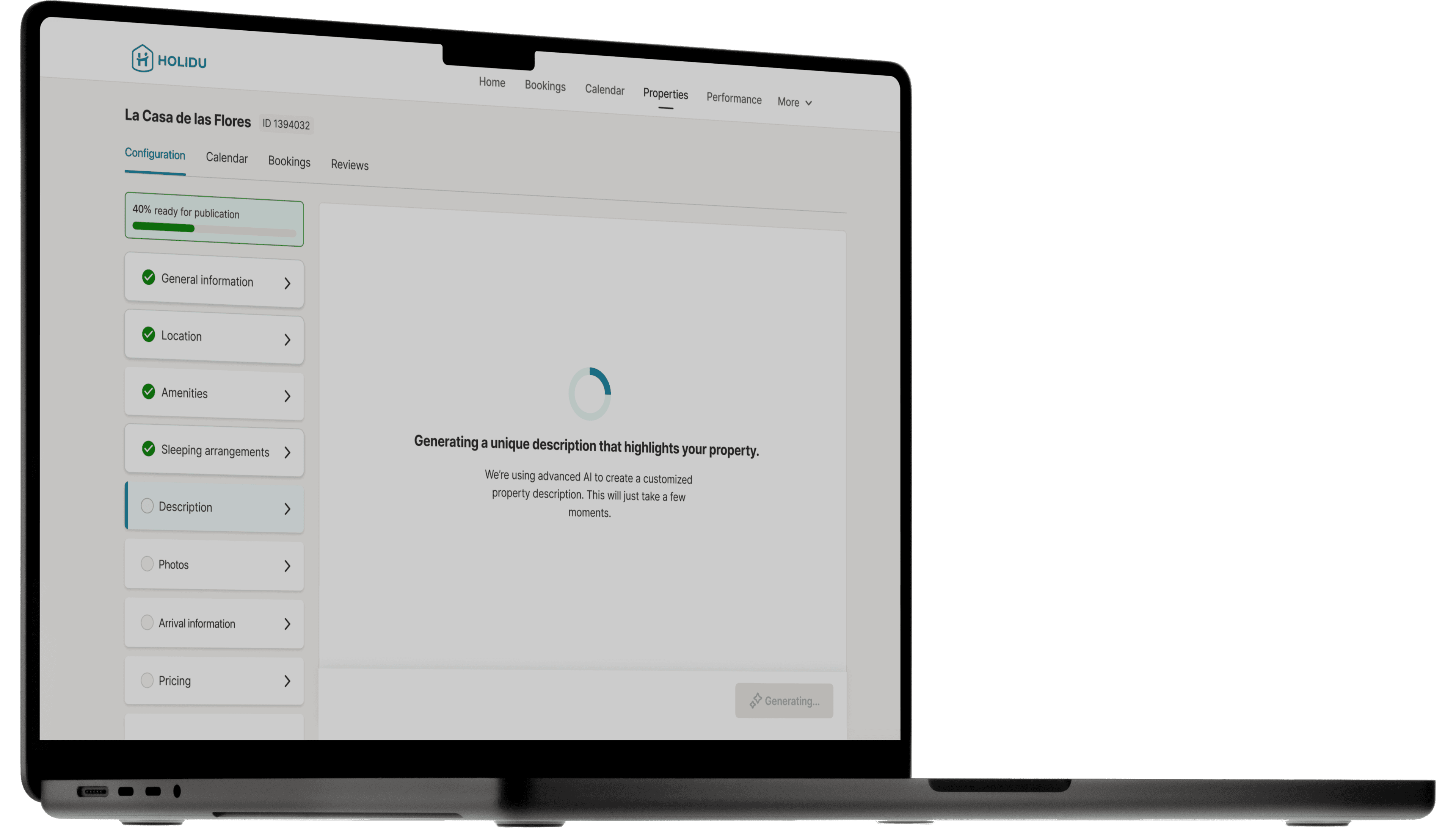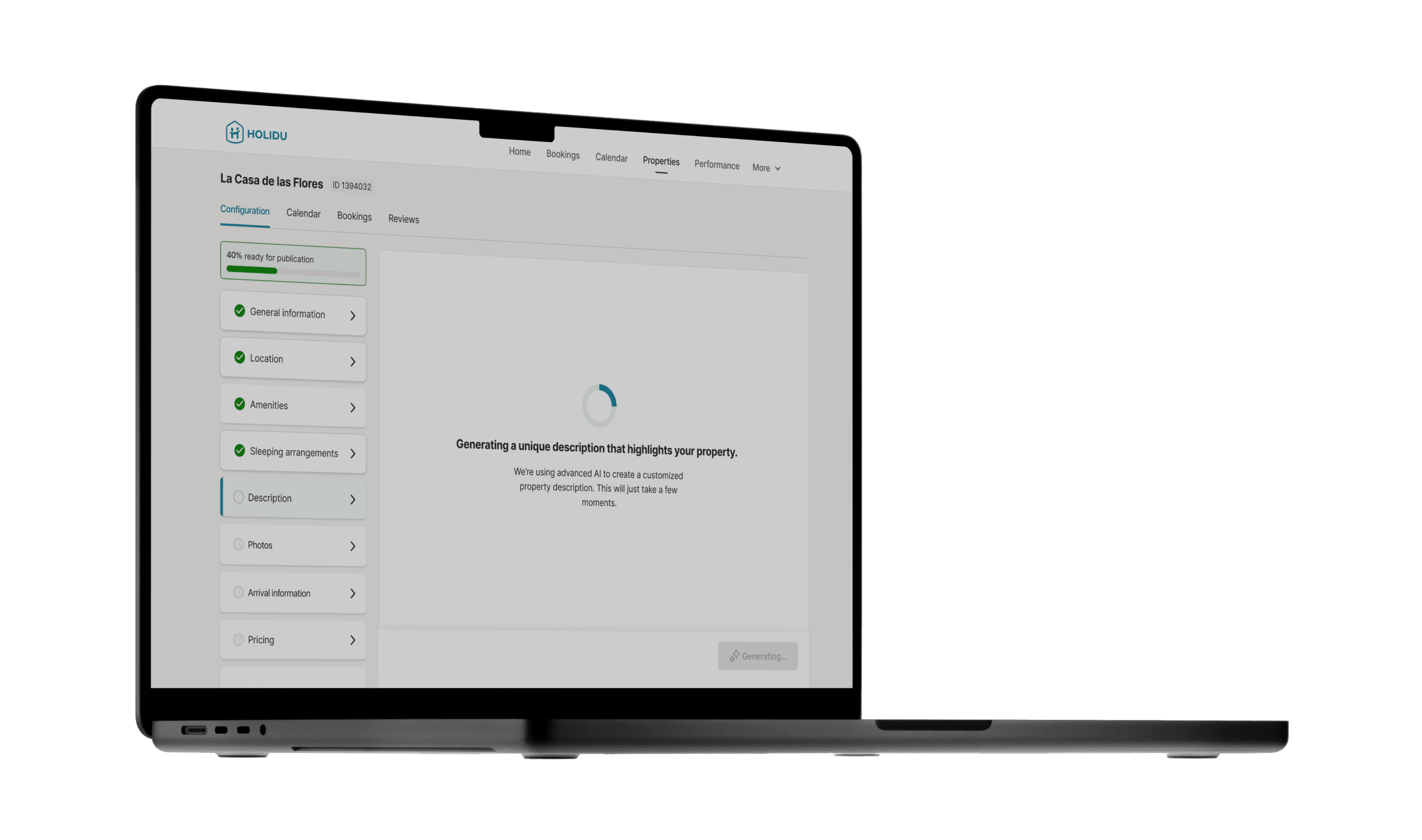 In collaborazione con il nostro partner Holidu, abbiamo sviluppato uno strumento completamente automatizzato per scrivere testi descrittivi altamente ottimizzati per affitti vacanze utilizzando l'IA. Holidu gestisce migliaia di proprietà in tutta Europa, e ogni proprietà necessita di descrizioni accattivanti che attirino gli ospiti rispettando rigorose norme delle piattaforme.