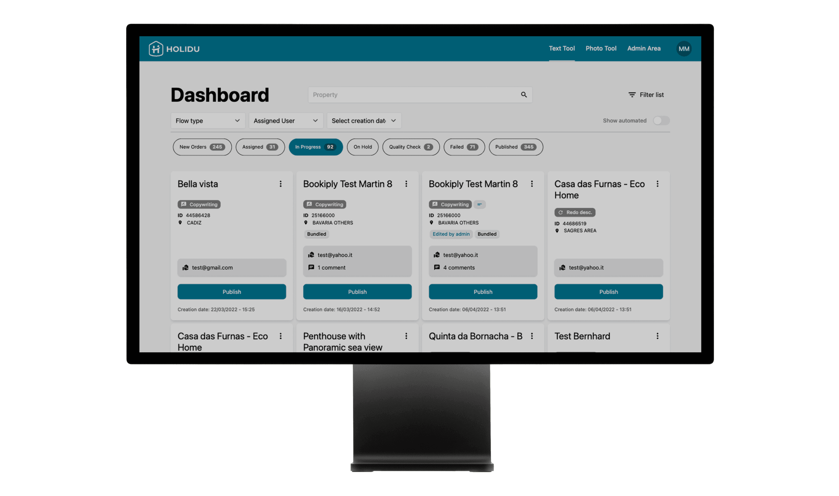 Prima dell'IA, Holidu si affidava a un processo manuale laborioso. Abbiamo sviluppato un software che ha permesso a Holidu di scalare distribuendo il lavoro a copywriter freelance in tutta Europa. I copywriter scrivevano descrizioni in inglese e tedesco, poi i traduttori revisionavano i testi tradotti automaticamente con DeepL. Con la crescita di Holidu, questo modello divenne insostenibile.